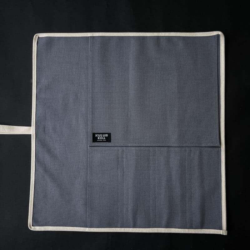 Kikusumi KULUR Chef Knife Rolls for traveling chefs is expertly crafted in Shizuoka from thick cotton canvas for a clean, minimalist aesthetic. KULUR ROLL comes in 2 sizes that fit either 4 or 6 knives. Additionally, kitchen tools like scissors, chopsticks or spatulas can be fitted together inside the pockets rather than knives. KULUR ROLL is designed to provide safety for carrying knives to and from work. Strong double stitching is sewn for strength with colors that match the fabrics.