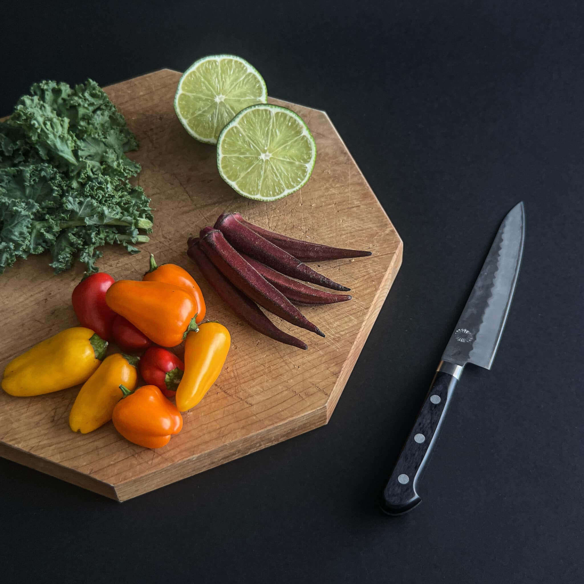 Choosing the best knife for cutting vegetables it is important to consider the size of the vegetable and the intended result. In the case of shogoin daikon we want a thin slice that is easy to eat. When whole the this daikon is very wide. A knife that is tall across the blade yet thin and sharp will create the best result. Nakiri and Kamagata usuba are designed for this type of job. Nakiri is double bevelled and easiest to use for a beginner. Kamagata usuba hails from the Kansai area of Japan (Kyoto Osaka Kobe). Usuba is single side and offers greater precision as its blade is designed to lift away as you slice. Because of this the slice will have a better texture or mouth feel.