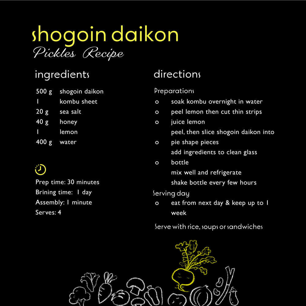 In Japan pickles are called tsukemono つけもの and most often accompany the closing course of a meal. Steamed rice, miso soup and pickles are the classic ending to a meal both at home and in kaiseki restaurants. Pickles offer unique flavors and pickles that can be subtle or intense, depending on the flavoring and fermentation. Our shogoin daikon pickles recipe has a very short brine time with fresh citrus flavors and crunchy textures. Serve Japanese style with steamed rice and soup for a classical meal. French bistros often place a bottle of gherkins on the table at the beginning of the meal and you could certainly do the same to add a fun element to the meal. Simple lunches like sandwich and soup would also go well with Shogoin Daikon pickles. Enjoy!