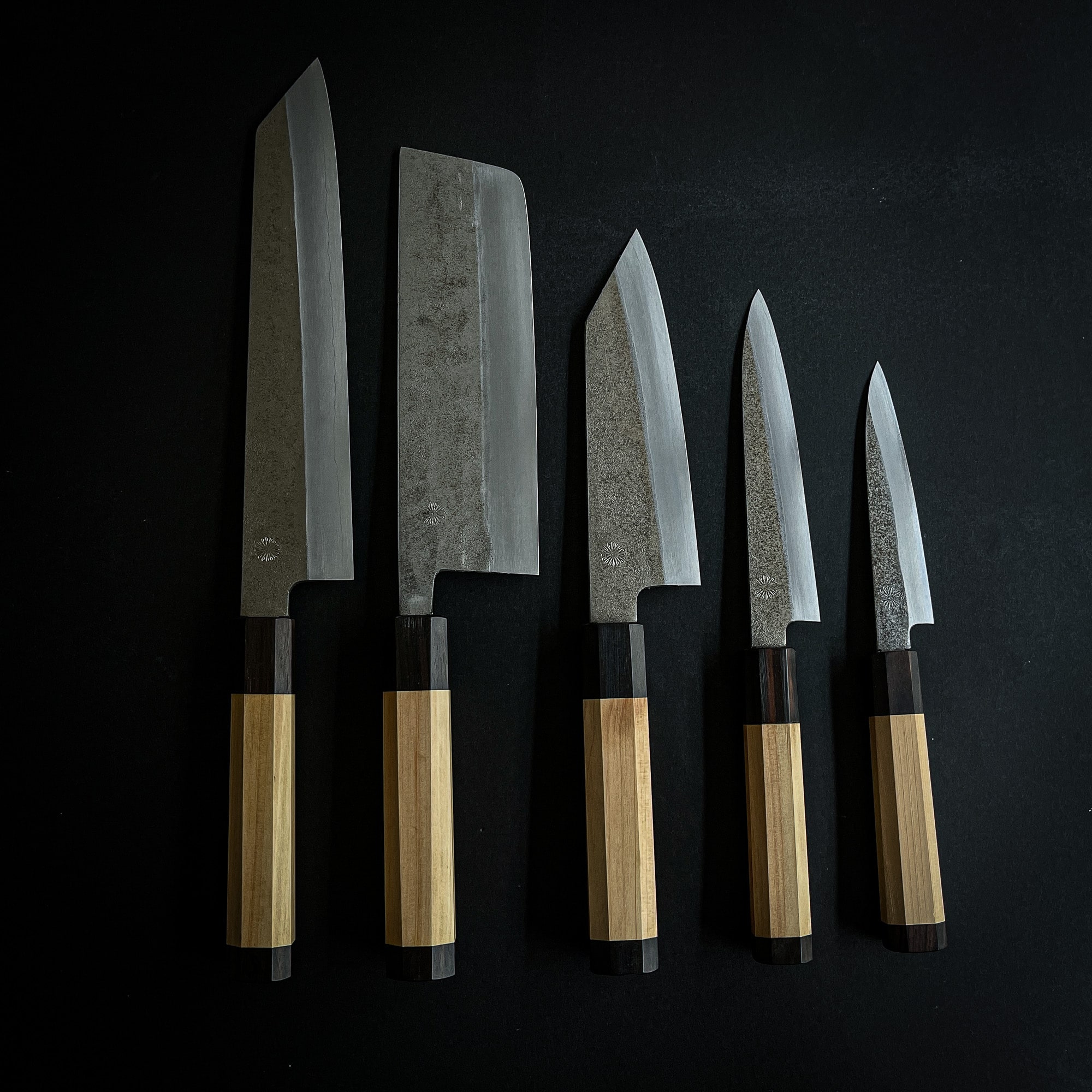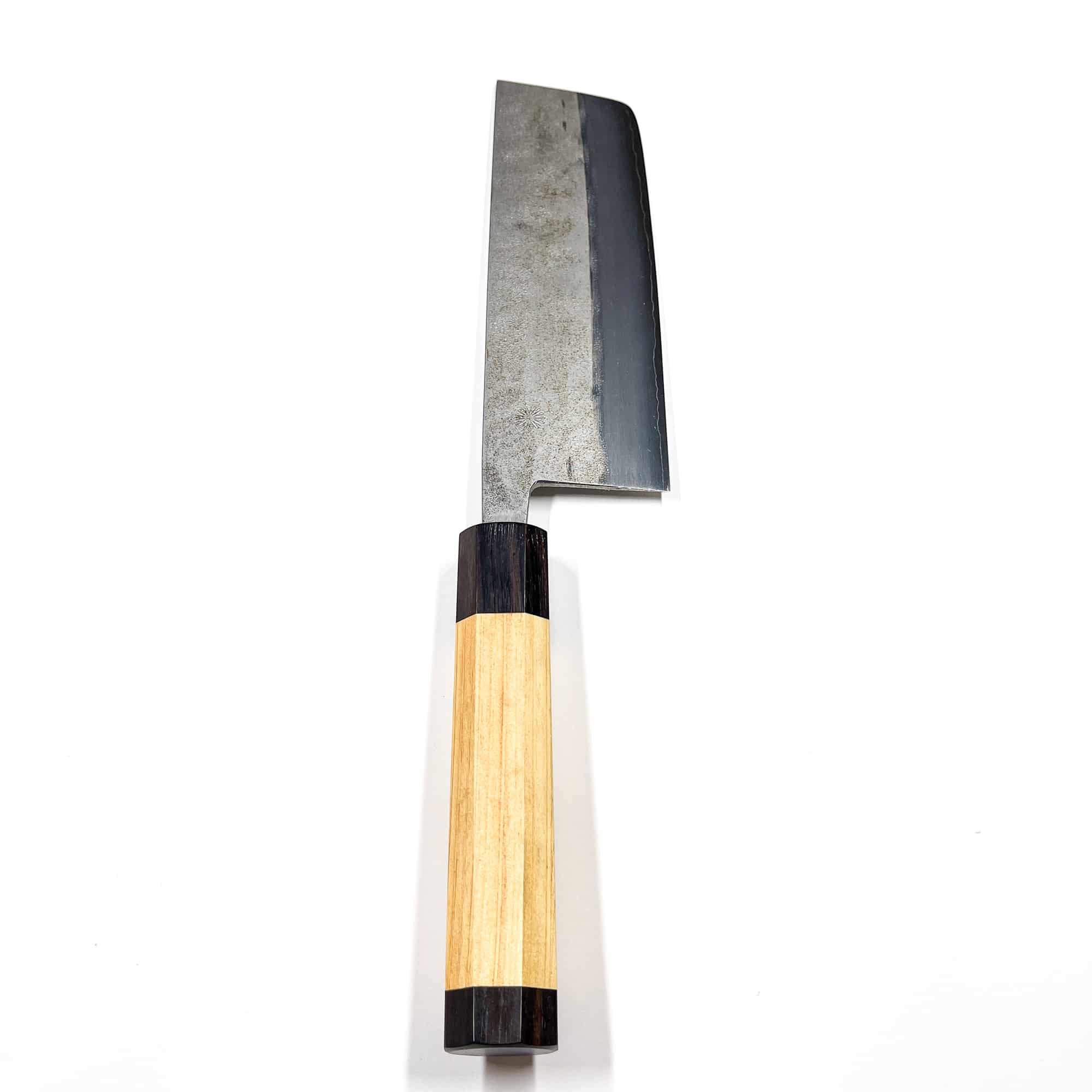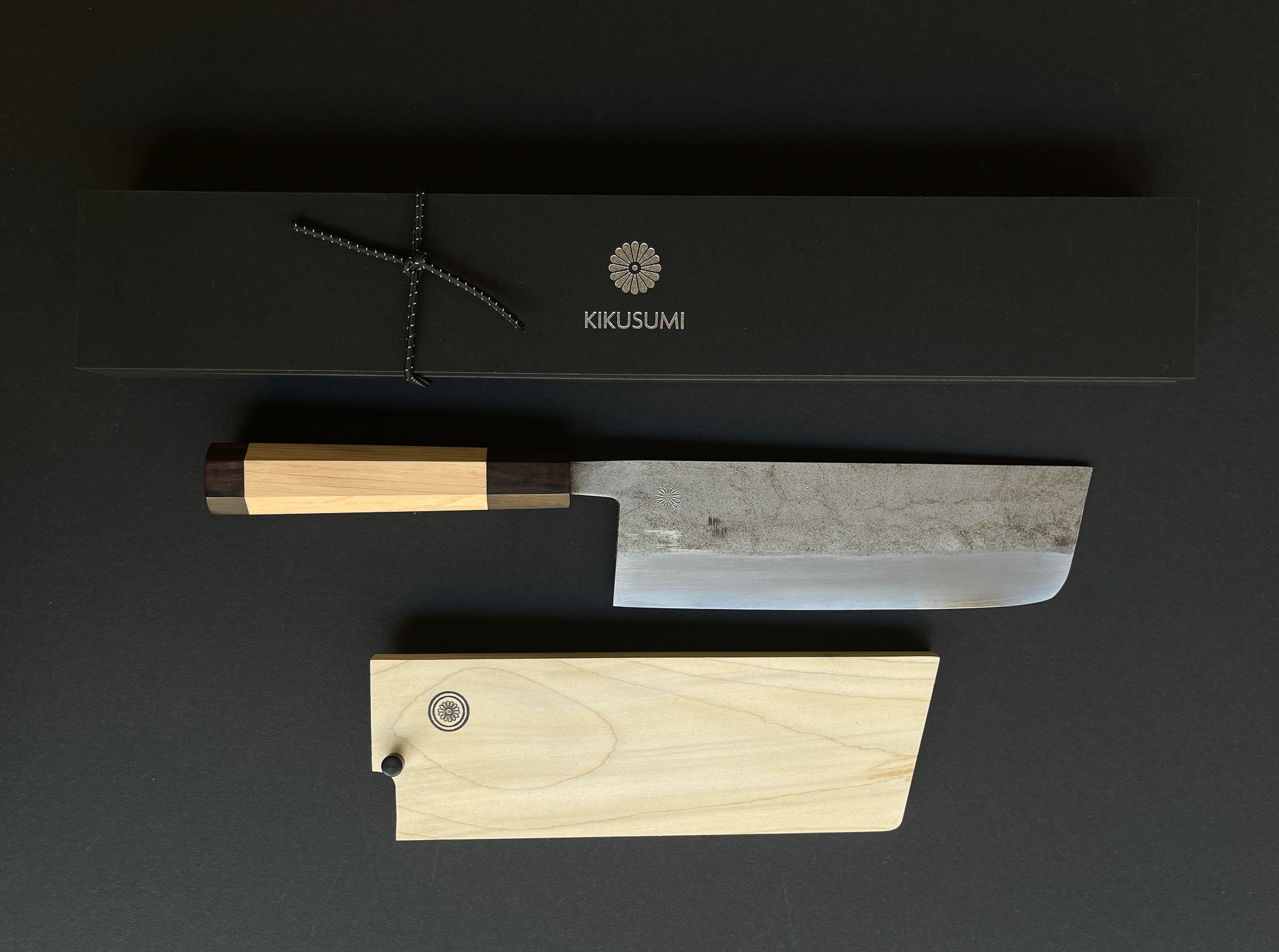 Kyogata Nakiri knife has a uniquely shaped blade that makes it optimal for preparing vegetables. The blade is wide from heel to tip so it can process vegetables evenly and with a variety of motions that allow the blade to do most of the work. . Whether pushing the knife down and forward or using the Japanese katsura peeling motion, the BLACK GHOST Kengata Nakiri makes it easy with its thin, sharp and solid blade. Kyogata is differs from regular nakiri in that the front end is slanted and a unique Kyoto version. This nakiri knife is a must have in kitchens processing large amounts of vegetables and fruit for smoothies, soups and salads For preparing fruit and vegetables the BLACK GHOST Kyogata Nakiri is a remarkably consistent and precise tool to own with a beautiful look and feel that inspires.