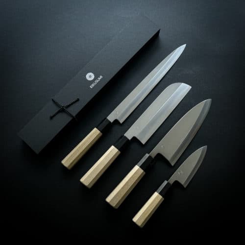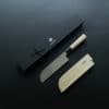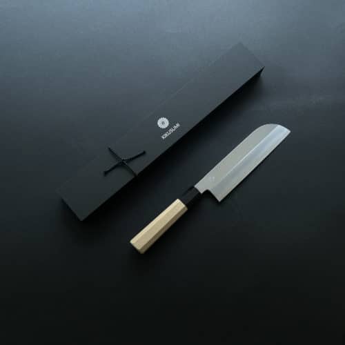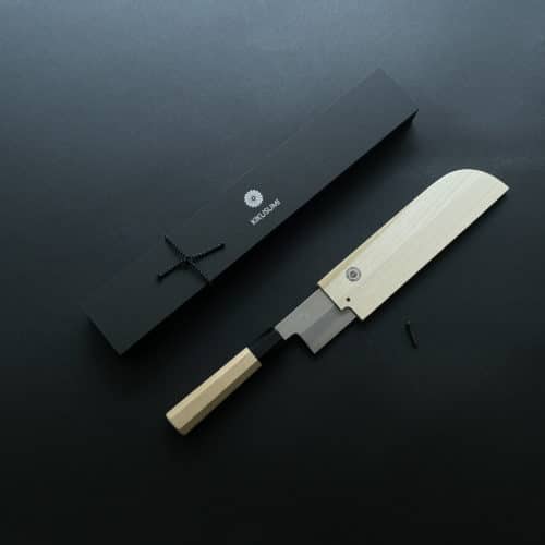 Chosen by Chef Norio Ueno of famed Osaka kaiseki restaurant Ichijusai Ueno, GHOST Kama Usuba knife has a uniquely shaped blade that makes it optimal for preparing vegetables and fruits. The blade has a consistent width from heel to tip so it can process vegetables evenly and with a variety of motions that allow the blade to do most of the work. . It also has a tip that tapers to a sharp point making it excelent for scoring the surface of duck, eggplant, cucumbers or whatever you want. The solid weight of the blade improves cutting consistency. Whether pushing the knife down and forward or using the Japanese katsura peeling motion, the GHOST Kama Usuba makes it easy with its thin, sharp and solid blade. This vegetable knife is a must have in kitchens processing large amounts of vegetables and fruit for smoothies, soups and salads For preparing fruit and vegetables the GHOST Kama Usuba is a remarkably consistent and precise tool to own with a beautiful look and feel that inspires. Made in Sakai.