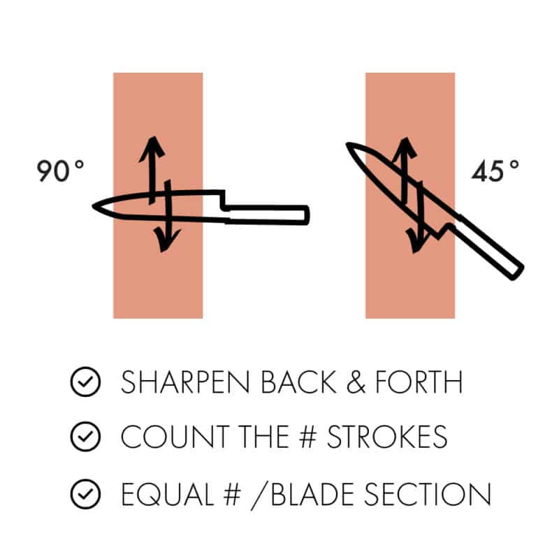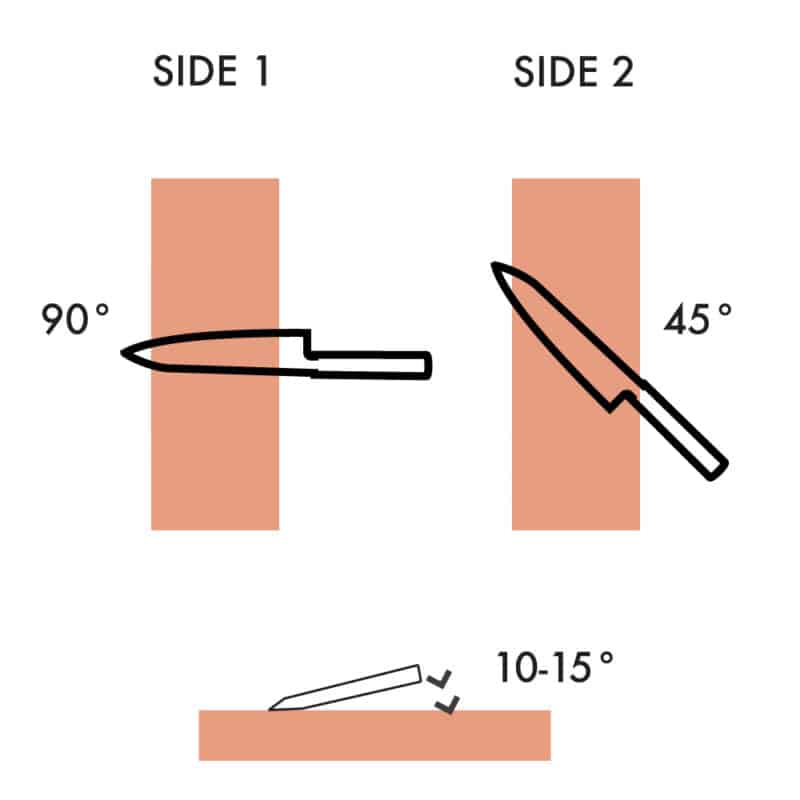 Keeping a consistent blade angle results in better sharpening. Take your time to set up the proper blade angle, then maintain it as you move across the whetstone. First side - position knife at 90° to the whetstone. Raise the back of the knife until there is a 12-15 ° angle to the whetstone. Second side - position knife at 45° to the whetstone. Raise the back of the knife until there is a 12-15 ° angle to the whetstone.