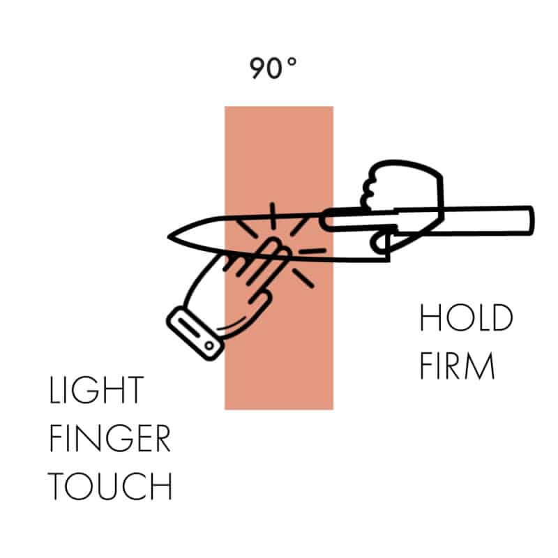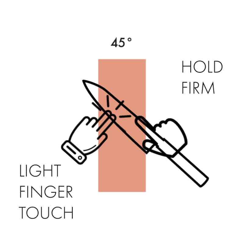 Use one hand to hold the angles firm. Place the finger tips at the edge of the blade where you want to sharpen. Use light downward pressure to keep it stable as the blade slides across the whetstone surface.